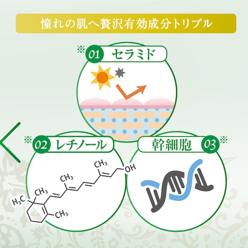 【全成分】水、ヒマワリ種子油、コメヌカ油、BG、グリセリン、トレハロース、ペンチレングリコール、モリンガオイル*1,ゲットウ葉エキス、ヒト脂肪由来幹細胞順化培養液、セラミドEOP、セラミドNG、セラミドNP、セラミドAG、セラミドAP、メボウキエキス、植物精油(レモン)、オキナワモズクエキス、アロエベラ液汁、水添レシチン、水添レチノール、フィトステロールズ、トリ(カプリル酸/カプリン酸)グリセリル、クエン酸、香料、*1ワサビノキ葉オイル