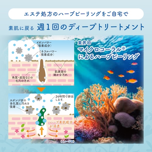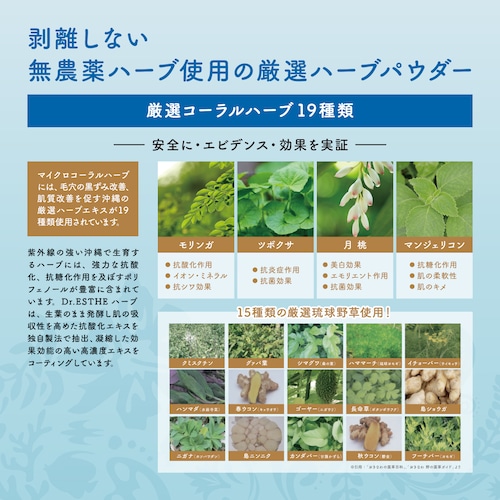 沖縄の無農薬栽培で育てられた安心のハーブ19種を食品レベル80メッシュまで細かく粉砕し、お肌に負担のないように滅菌処理したパウダーをミネラル豊富な海底に存在する珊瑚の化石を微小なパウダーにした”マイクロコーラル”にコーティング。セットのハイドロジェルホワイトに混ぜて使用することで、ハーブエキスが肌へ浸透し、100%素材のままの美容効果が生まれます。